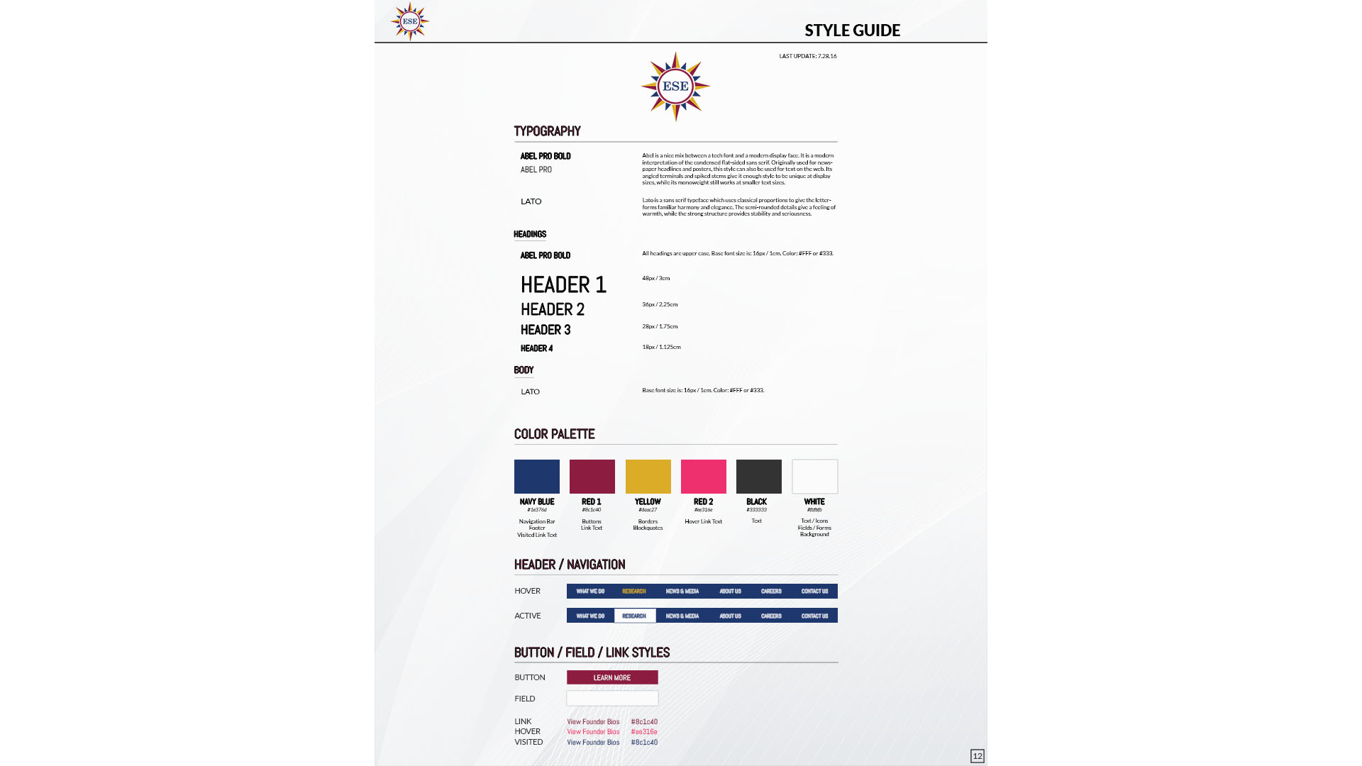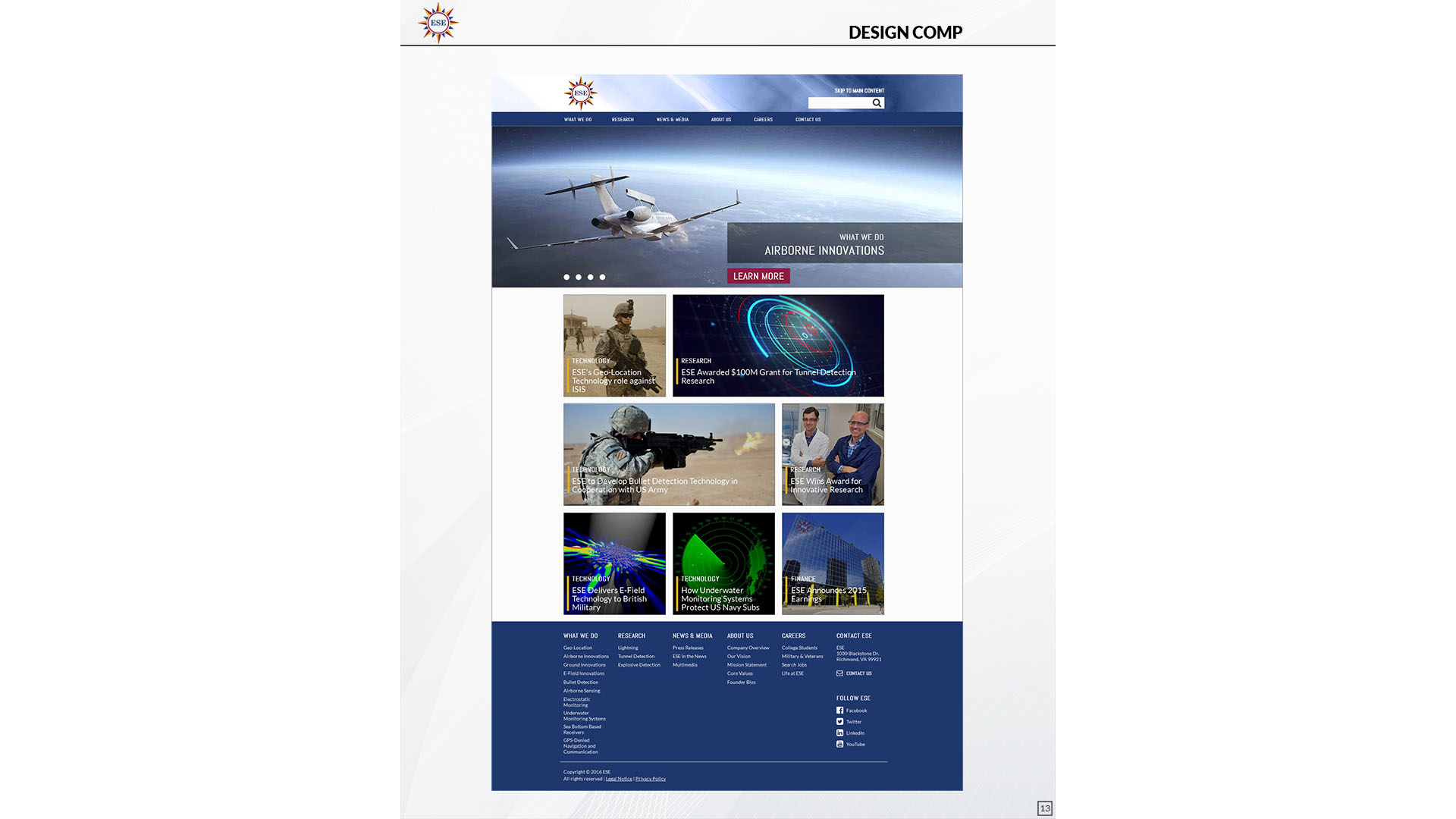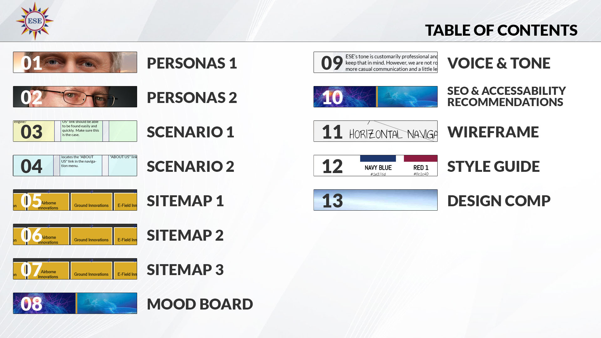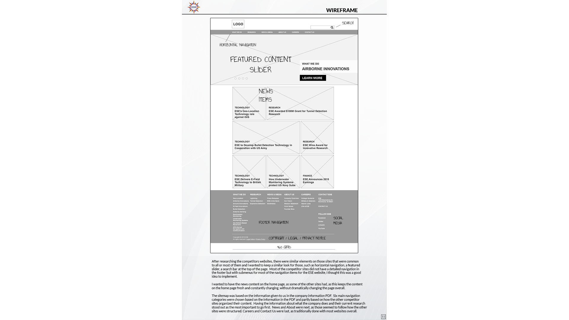 We were given some information about the company, a logo, and some information about their competitors. We were to take that information and create all the items in the list above and put together a UX packet for a ficticious company named ESE, which is a small to midsized company specializing in a niche market for defense applications.