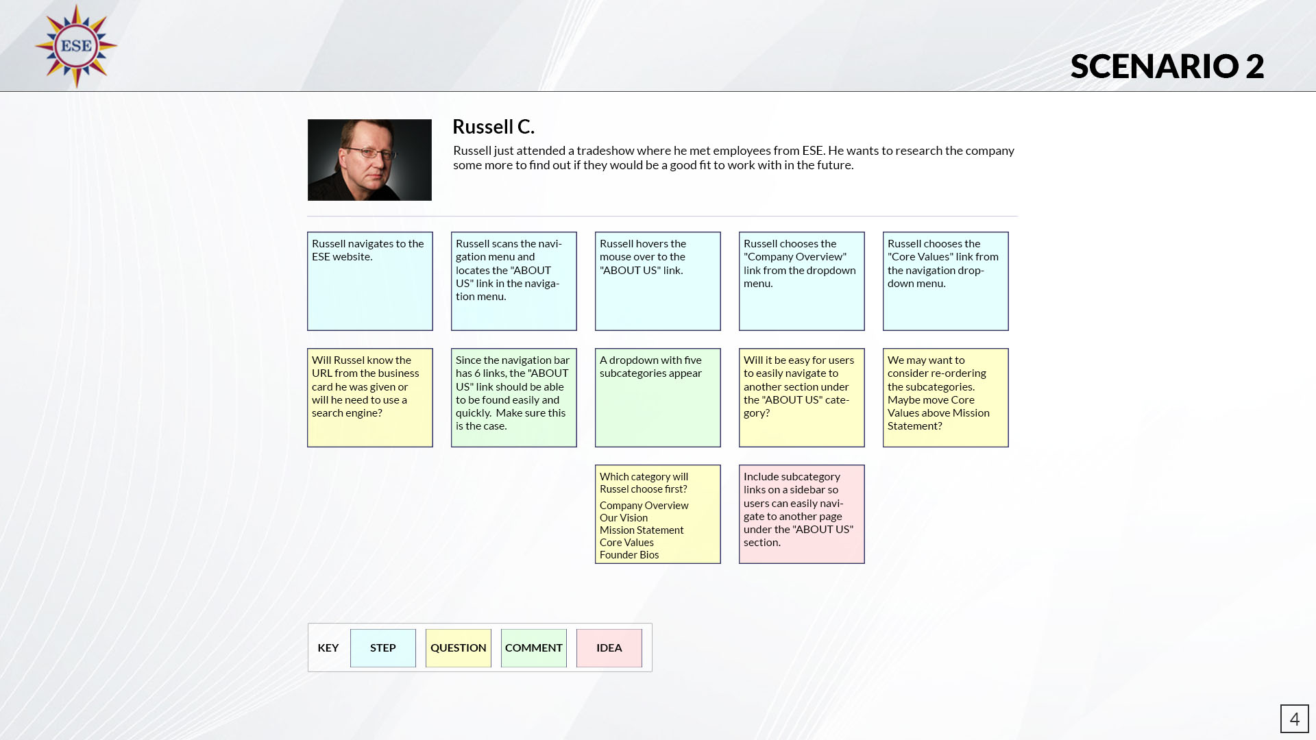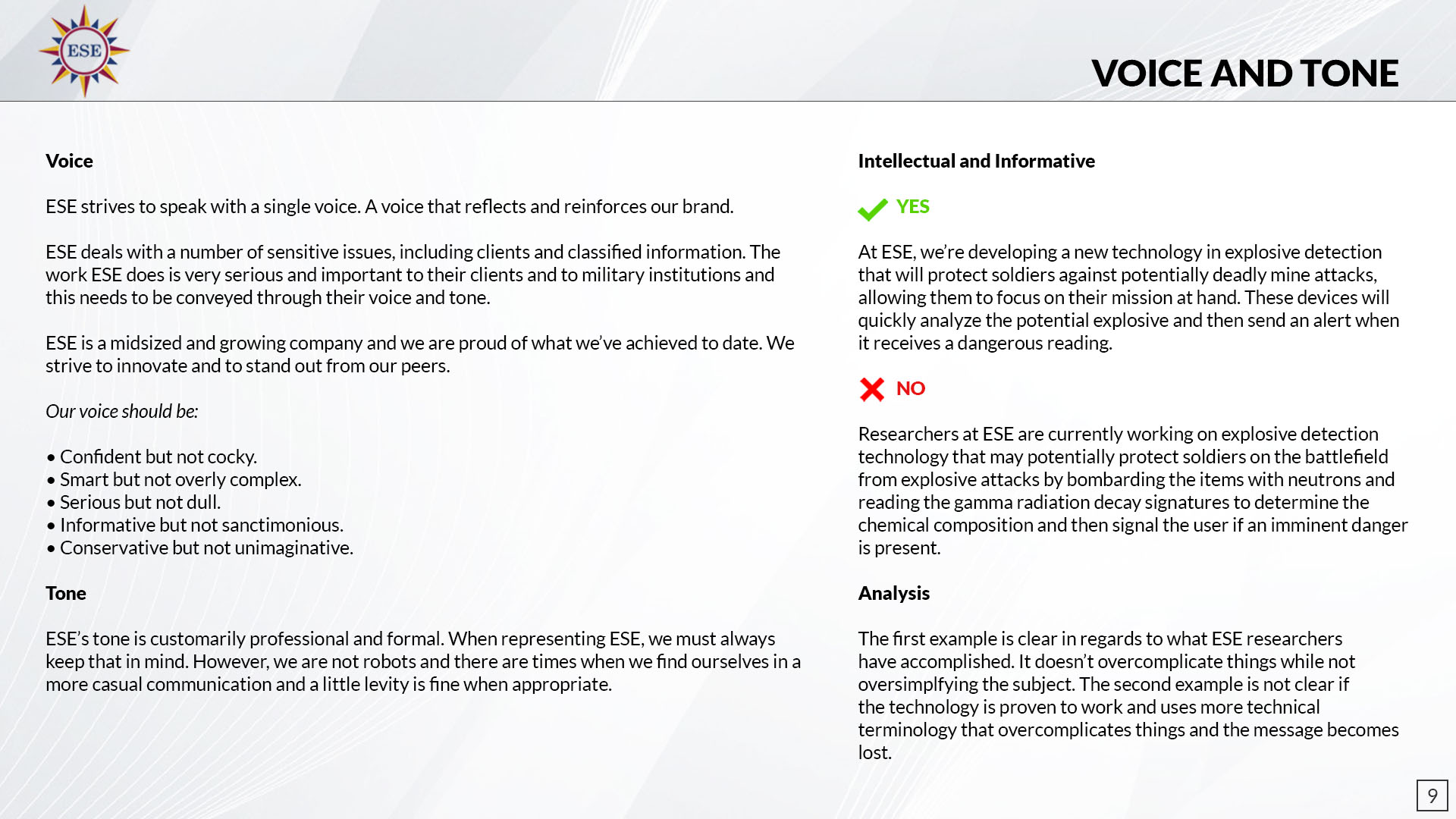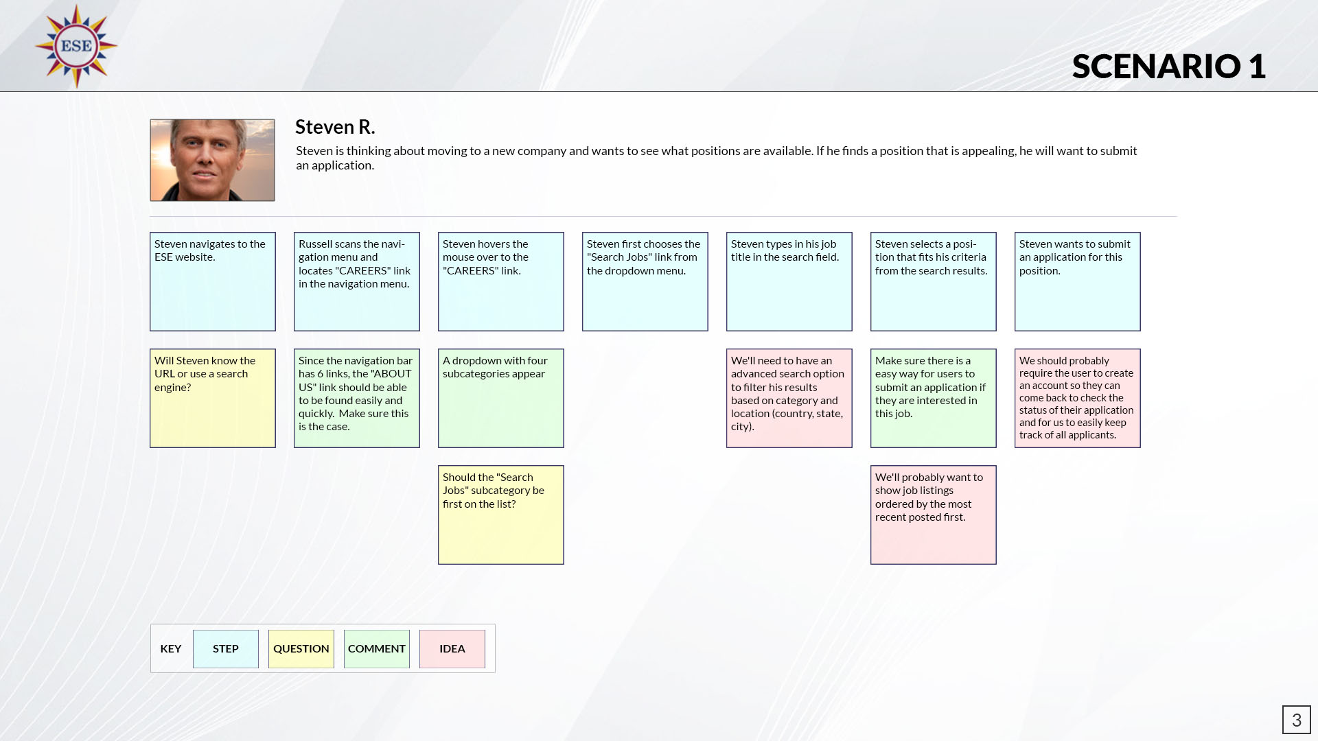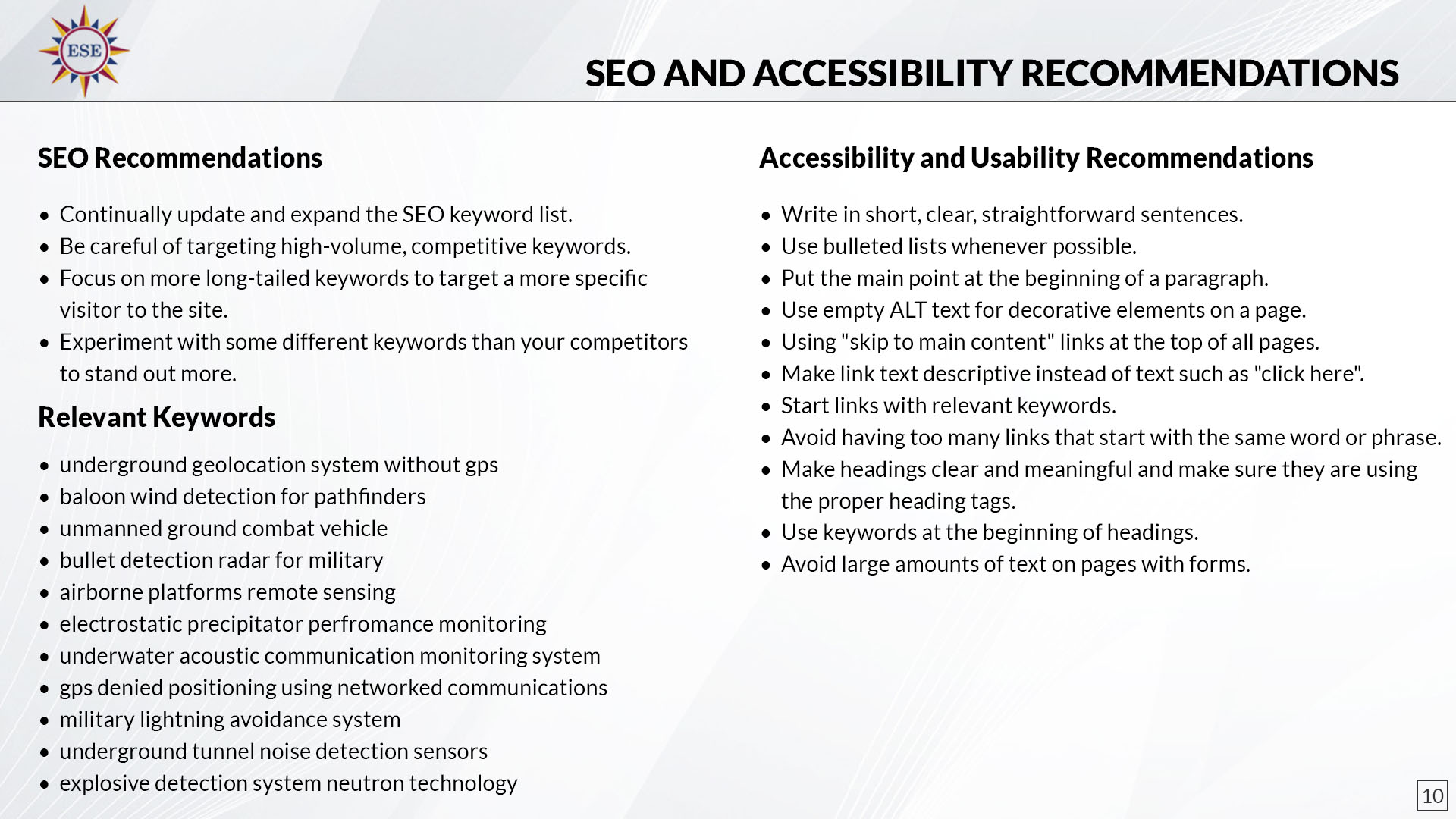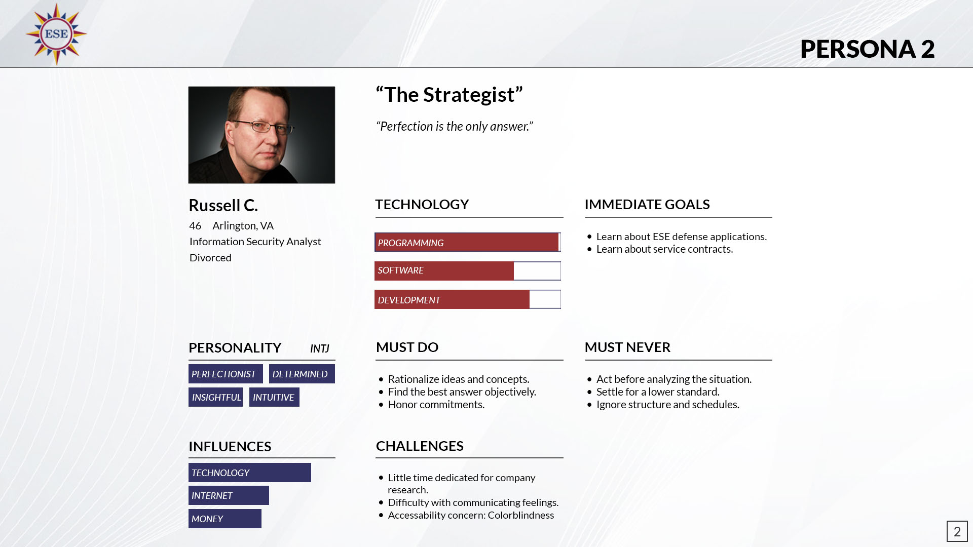 We were given some information about the company, a logo, and some information about their competitors. We were to take that information and create all the items in the list above and put together a UX packet for a ficticious company named ESE, which is a small to midsized company specializing in a niche market for defense applications.